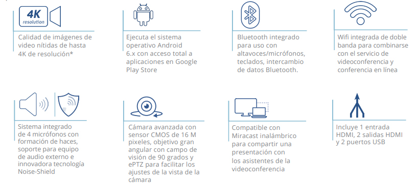 El GVC3210 es un innovador dispositivo de videoconferencia ideal para pequeñas a medianas empresas que buscan una solución de videoconferencia fácil de usar, pero potente. Soportando resoluciones de video de alto nivel con capacidad de ultra alta definición de hasta 4K, el GVC3210 convierte cualquier videoconferencia en una poderosa y evidente enriquecedora experiencia. Diseñado para permitir que los usuarios personalicen su solución de acuerdo con sus necesidades específicas de comunicación, el GVC3210 puede combinarse con la mayoría de los servicios de videoconferencia y conferencia en línea para crear un sistema de conferencia de múltiples puntos. Este dispositivo de videoconferencia ejecuta el sistema operativo Android y ofrece acceso total a Google Play Store. Esto permite a los usuarios utilizar cualquier aplicación de conferencia o comunicación para Android. El GVC3210 viene equipado con la sofisticada tecnología Noise-Shield para bloquear el ruido de fondo y maximizar la calidad del audio. Las características adicionales incluyen un sistema avanzado de 4 micrófonos con capacidad de conformación de haces (beam-forming), un sensor CMOS de alta calidad con 16 M pixeles y ePTZ para facilitar los ajustes de la vista de la cámara y Miracast inalámbrico para compartir contenido de manera conveniente. Este dispositivo de videoconferencia simple pero poderoso es la elección ideal para pequeñas y medianas empresas que buscan una opción de precio accesible que todavía cuente con las características de vanguardia que se necesitan para mantener comunicaciones empresariales de alta calidad.